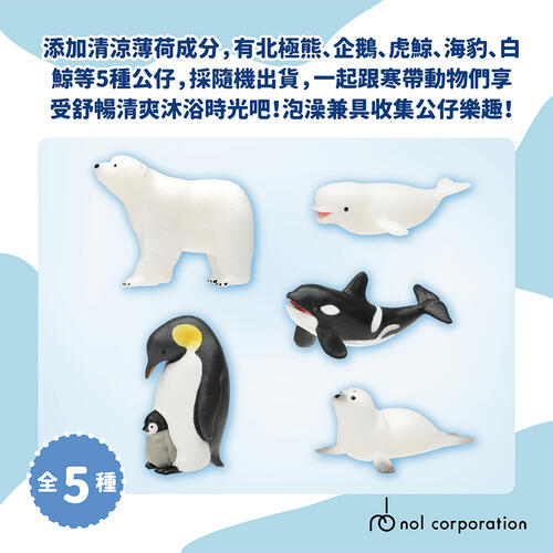 添加清涼薄荷成分,有北極熊、企鵝、虎鯨、海豹、白鯨等5種公仔,採隨機出貨,一起跟寒帶動物們享受舒暢清爽沐浴時光吧!泡澡兼具收集公仔樂趣!