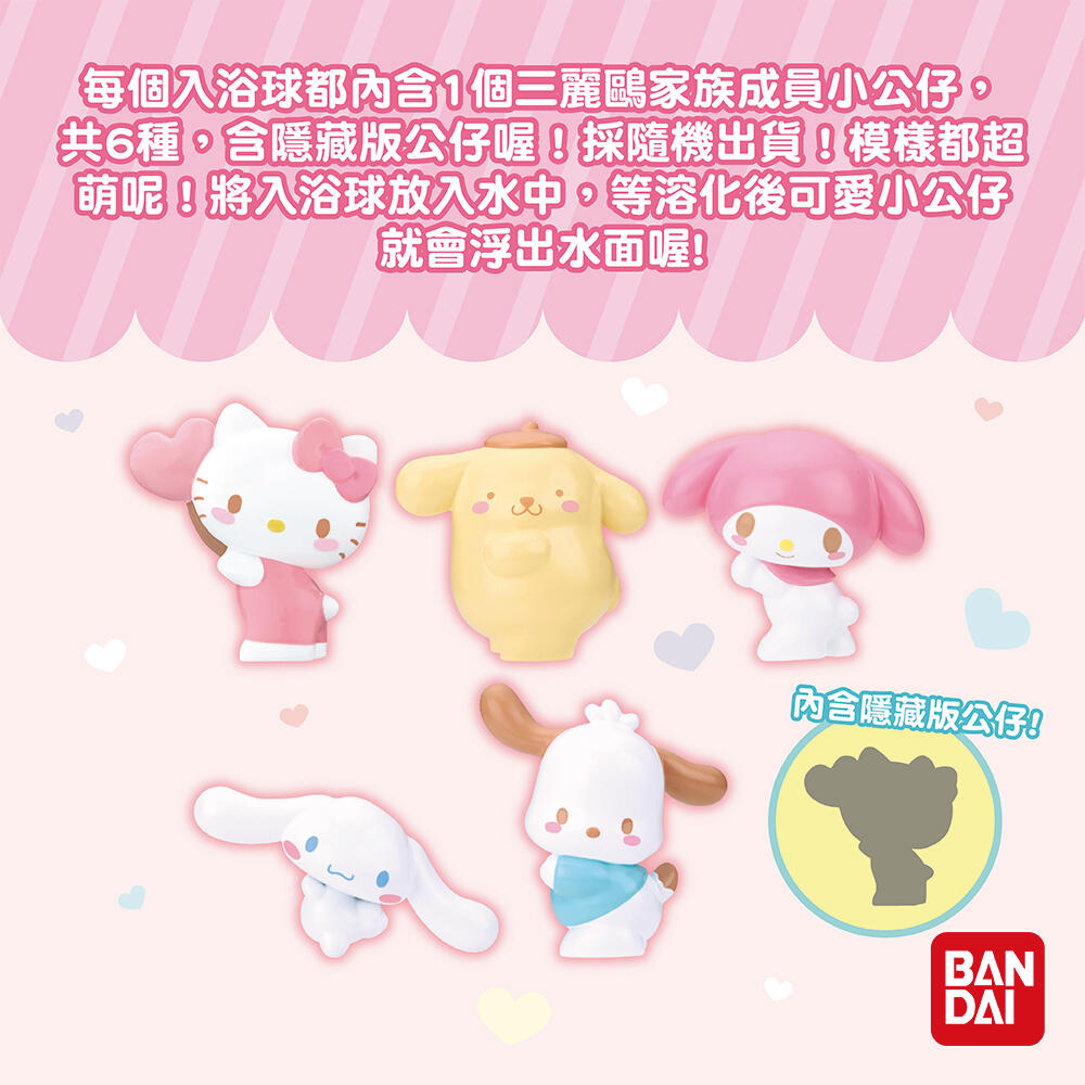 每顆入浴球都內含1個三麗鷗家族成員小公仔,共10種,採隨機出貨,每個都佩戴不同顏色蝴蝶結,模樣超萌呢!將入浴球放入水中,等溶化後可愛小公仔就會浮出水面喔! 一起來收集吧! 香氣:草莓蛋糕香味